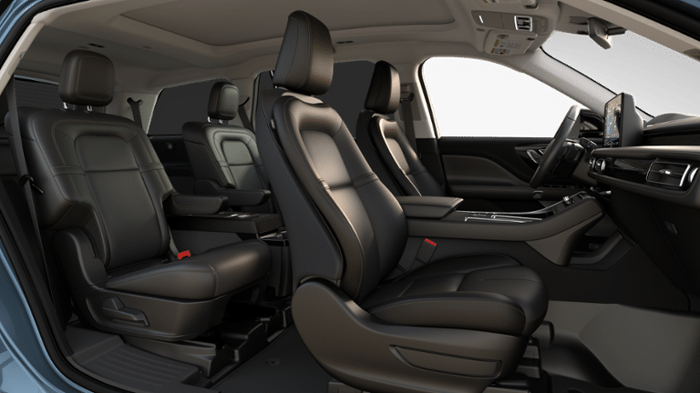 14 Speakers, 3rd row seats: split-bench, 4-Wheel Disc Brakes, 40/Mini Console/40 Dual Captain's Chairs, ABS brakes, Adaptive suspension, Advanced Heads-Up Display, Air Conditioning, Alloy wheels, AM/FM radio: SiriusXM, Apple CarPlay/Android Auto, Audio memory, Auto Air Refresh, Auto Heated and Ventilated Driver and Passenger Seats, Auto High-beam Headlights, Auto-dimming door mirrors, Auto-dimming Rear-View mirror, Automatic temperature control, Black Exterior Elements, Body-Color Exterior Elements, Brake assist, Bumpers: body-color, Compass, Delay-off headlights, Driver door bin, Driver vanity mirror, Dual front impact airbags, Dual front side impact airbags, Electronic Stability Control, Emergency communication system: 911 Assist, Equipment Group 200A Reserve I, Four wheel independent suspension, Front anti-roll bar, Front Bucket Seats, Front Center Armrest, Front dual zone A/C, Front reading lights, Full Rear Console, Fully automatic headlights, Garage door transmitter, Genuine wood console insert, Genuine wood dashboard insert, Heads-Up Display, Heated door mirrors, Heated front seats, Heated steering wheel, HVAC memory, Illuminated entry, Jet Appearance Package, Knee airbag, Leather steering wheel, Lincoln App, Lincoln BlueCruise Equipped (4-Years Included), Lincoln Connectivity Package (4-Years), Lincoln Digital Experience, Low tire pressure warning, Memory seat, Navigation system: Google Maps, Occupant sensing airbag, Outside temperature display, Overhead airbag, Overhead console, Panic alarm, Passenger door bin, Passenger vanity mirror, Power door mirrors, Power driver seat, Power Liftgate, Power moonroof: Panoramic Vista Roof, Power passenger seat, Power steering, Power windows, Premium Leather Front Captain's Chairs, Radio data system, Radio: Revel Audio System with 14 Speakers, Rain sensing wipers, Rear air conditioning, Rear anti-roll bar, Rear audio controls, Rear dual zone A/C, Rear reading lights, Rear window defroster, Rear window wiper, Remote keyless entry, Security system, SiriusXM, Speed control, Speed-Sensitive Wipers, Split folding rear seat, Spoiler, Steering wheel memory, Steering wheel mounted A/C controls, Steering wheel mounted audio controls, Tachometer, Telescoping steering wheel, Tilt steering wheel, Traction control, Trip computer, Turn signal indicator mirrors, Variably intermittent wipers, Ventilated front seats, Wheels: 21 Bright-Machined Aluminum with Dark Alloy Painted Pockets, Wheels: 22 Black Aluminum, Wireless Charging Pad.