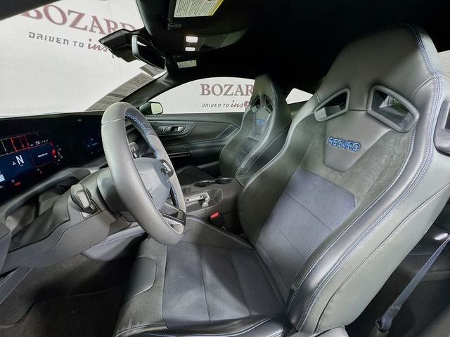 This 2024 Ford Mustang Dark Horse is finished in a stunning White exterior, complemented by the Tarnish Dark Low Gloss/Gloss Blk Vinyl Hood Stripe. The 19-inch Tarnished Aluminum wheels and the Performance Front Aero Splitter and Rear Spoiler with Gurney Flap give this Mustang an aggressive and distinctive appearance that commands attention.